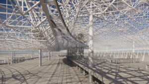 而陆侧双层景观平台约2700平方米,这里又是另一番景象。在66米超大跨度网架的巧妙设计下,悬挂着的双层平台不仅稳固安全,还营造出一种独特的空间感。这里主要规划为餐饮和小型商业综合体区域。当旅客们逛累了,走进一家温馨的咖啡店,点上一杯香浓的咖啡,坐在窗边,既能享受美食带来的愉悦,又能透过窗户欣赏到机场独特的风景。这种将商业与观景完美融合的设计,让旅客在候机过程中既能满足味蕾,又能获得身心的放松。