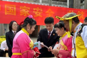 而在广场的另一边,法律知识竞答和民族法治游园活动同样热闹非凡。法律知识竞答现场,主持人刚念完一道关于民族法律法规的题目,台下的群众便纷纷举手抢答,大家的热情高涨,不少人甚至因为过于激动,身体前倾,几乎要站起来。一位年轻小伙第一个举起手,在得到主持人的允许后,迅速而准确地回答出了问题。他的脸上洋溢着自豪的笑容,赢得了周围群众的一片喝彩。在民族法治游园区域,传统游戏与普法完美结合,让人眼前一亮。就拿夹石螺游戏来说,参与者在夹取石螺的过程中,会随机抽取一张写有法律小知识的卡片。比如,有的卡片上写着“未成年人实施犯罪行为,同样要承担相应的法律责任”,参与者在玩乐的同时,不经意间就学到了一条法律知识。再看那竹竿舞区域,随着欢快的音乐响起,参与者们在竹竿间灵活地跳动着。而在竹竿的开合之间,地面上张贴着的法律标语格外醒目,如“依法维权,共建和谐社会”。大家在享受传统游戏乐趣的同时,也在潜移默化中接受着法治文化的熏陶。