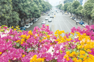 而青环路,则是一场浪漫的花之盛宴。三角梅和洋紫荆在这里竞相争艳,花朵如瀑布般从枝头倾泻而下。微风拂过,花瓣纷纷飘落,像是下起了一场梦幻的花雨。道路两旁,车辆缓缓行驶,车内的乘客也不禁被这美景吸引,透过车窗欣赏着这难得的春色。路边,一些新人正在拍摄婚纱照,他们在花海中摆出各种甜蜜的姿势,让这美丽的花朵见证他们的爱情。摄影师不停地按下快门,他笑着说:“青环路的春天简直是拍摄婚纱照的天堂,这些花为新人的爱情增添了无数浪漫的色彩。”