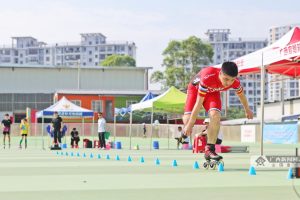 自由式轮滑的场地则是另一番景象。桩桶整齐排列,选手们单脚着地,身姿轻盈地在桩间穿梭。他们脚下的轮滑鞋仿佛被赋予了生命,时而快速变向,时而急停旋转,动作行云流水。在男子速度过桩项目中,玉林选手林宇轩以令人惊叹的速度和精准度,接连突破自己的最好成绩。每当他快速掠过桩桶,带起的风都会让最外侧的桩桶微微晃动,引得观众席上惊呼连连。